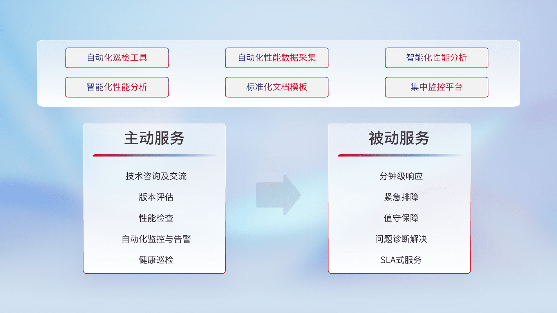 智能化工具和标准化文档,,保障服务质量,,提供主动服务(包含技术咨询、、、版本评估、、、性能检查、、、自动化监控与告警、、、、健康巡检)和被动服务包含(分钟级响应、、、紧急排障、、、值守保障、、、问题诊断解决、、SLA服务)。。。。