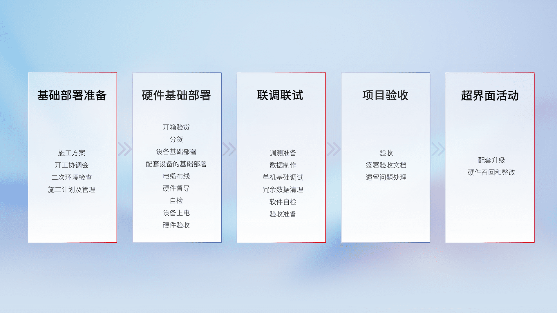 从基础部署准备、、硬件基础部署、、、联调联试、、、、项目验收、、、、越界面活动的全过程可追溯,,,保证施工质量和进度。。。